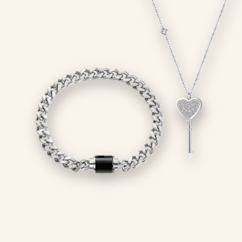 Crafted with care, the bracelet and necklace feature sleek finishes and detailed accents. The unique heart key design symbolizes how only your partner holds the key to your heart.
