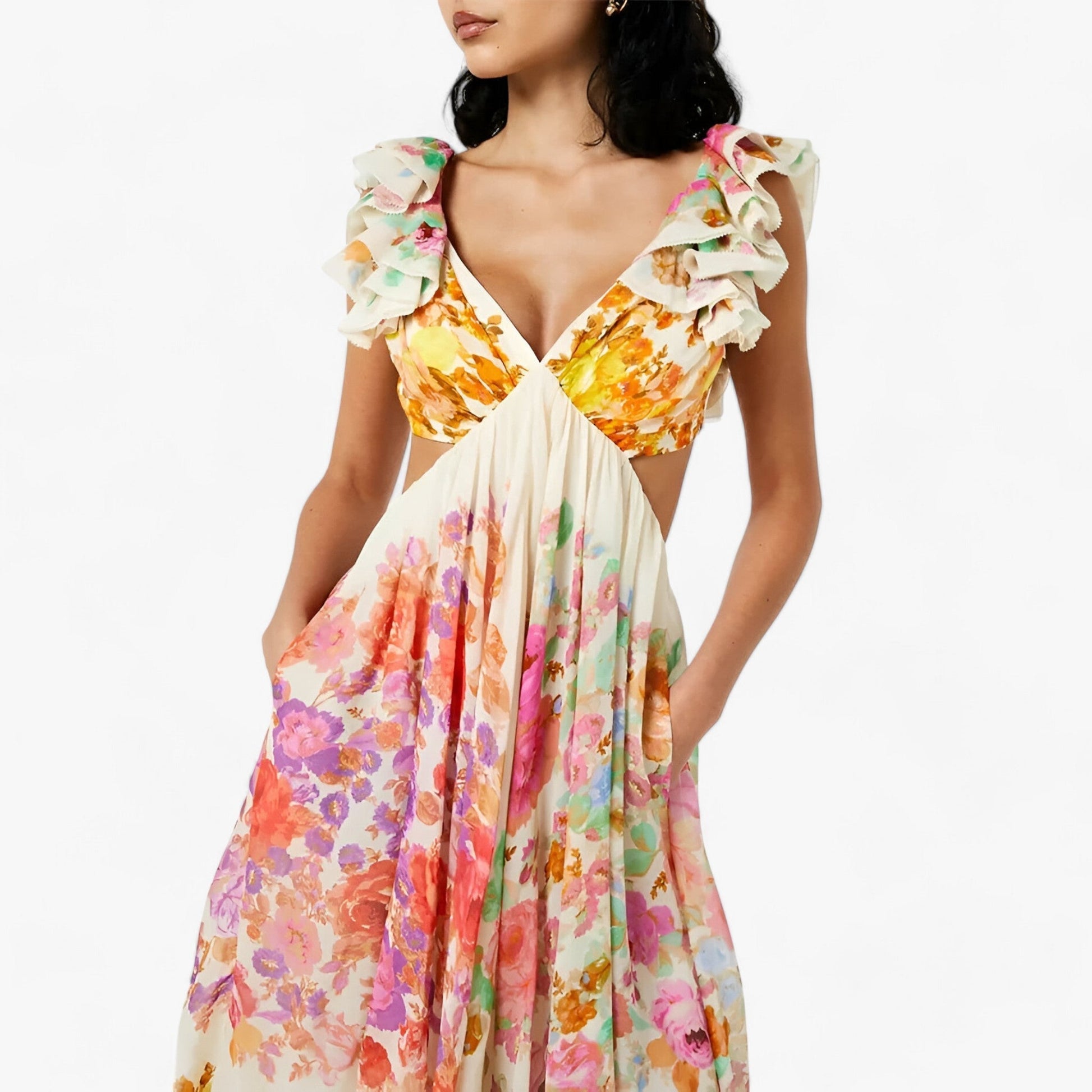 - Design: Features a beautiful placement print pattern, ruffled shoulders, waist cutouts, and a self-tie back for a chic and sophisticated look.
