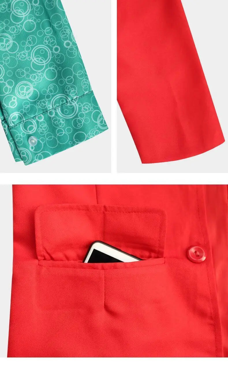 This vibrant clown outfit set features a bold red design crafted from durable polyester fabric, ideal for themed parties, theatrical performances, or festive events. The ensemble includes a vest, top, and additional costume components, designed to provide a complete look with a striking visual impact.