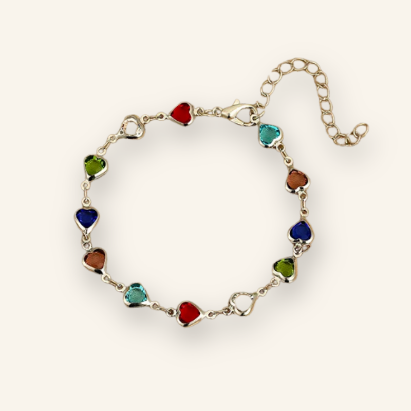 Add a pop of color to your jewelry collection with the Colorful Crystal Heart Bracelet. Featuring delicate heart-shaped charms in vivid hues, this piece brings joy and playfulness to any outfit.