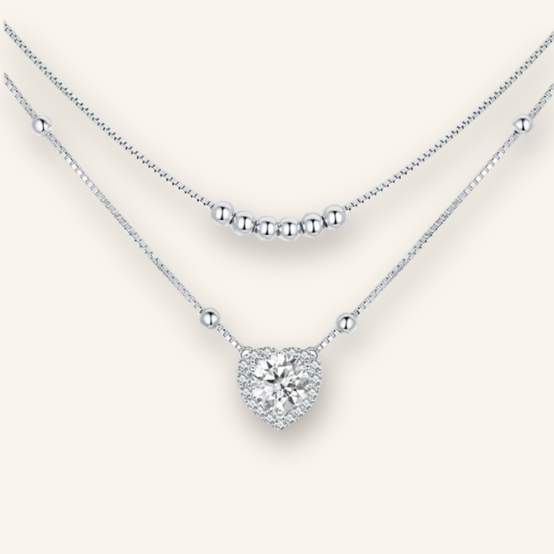 The Elegant Sterling Silver Heart Necklace is a breathtaking fusion of sophistication and modern charm. Featuring a dazzling one-carat moissanite centerpiece and a double-layer chain adorned with delicate silver beads, this piece is designed to turn heads.
