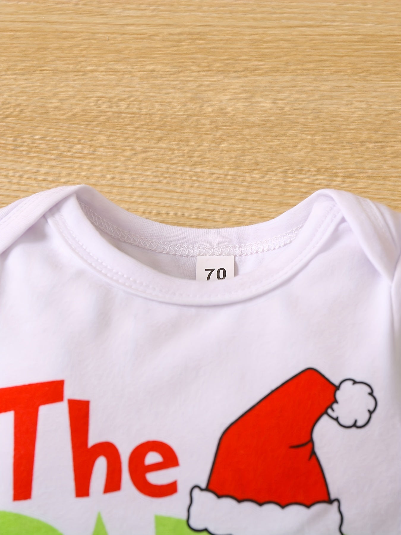 This two-piece baby outfit includes a long-sleeve printed bodysuit and a pair of soft fuzzy pants with built-in suspenders. The playful design and bright green color make it a fun choice for winter moments and holiday celebrations.