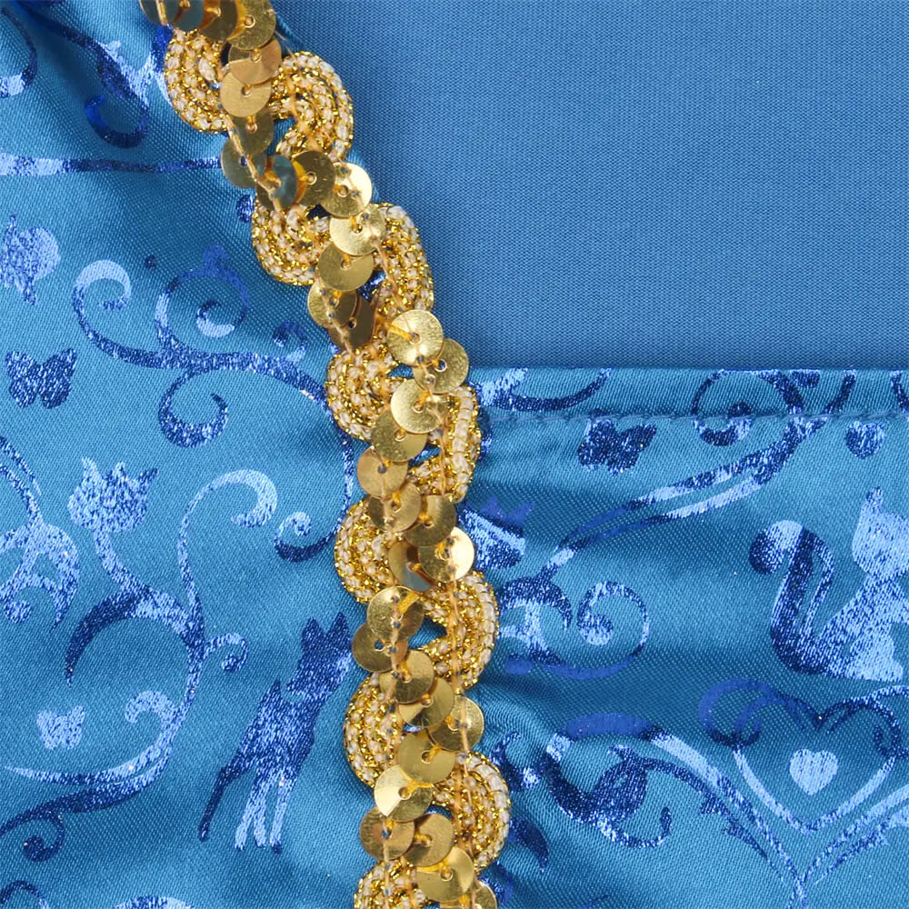This elegant princess dress and matching headband set is designed to showcase the iconic look of a beloved fairy tale character. Featuring a vibrant color palette and traditional design elements, this outfit offers a recognizable and thematic appearance suitable for cosplay, themed parties, Halloween, and other costume events.