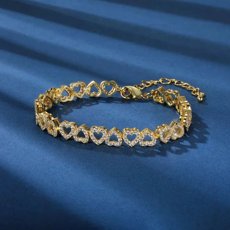 Each heart-shaped link is adorned with luminous zircon stones, capturing the essence of love and connection. Handcrafted with precision, this bracelet reflects a commitment to quality and beauty.